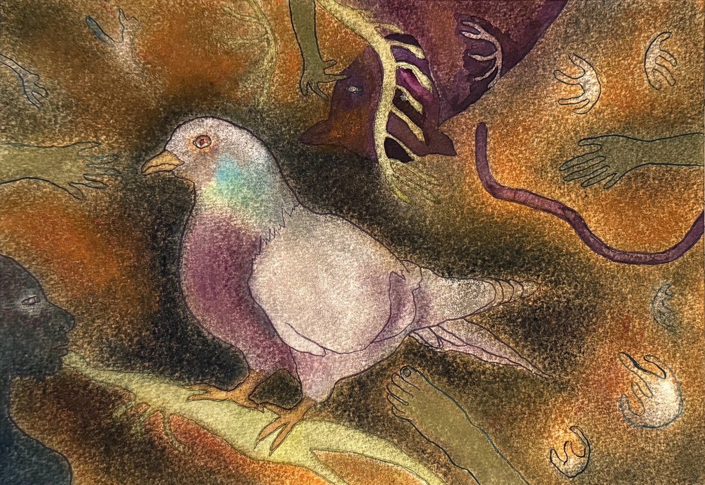 THE PIGEON WITH HER SHADOW2026Pastel and ink on rough rag paper